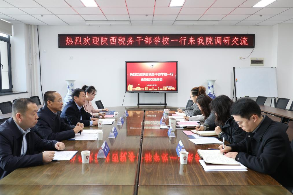 11月13日上午,陕西省税务干部学校党组书记、校长刘峰、党建办主任王建平、办公室主任兰岚、办公室干部董祥一行四人前来我院调研交流。学院党委书记姜宇、行政副院长雷振宁、办公室主任王晋华、院团委副书记殷大惟参加了座谈。座谈会由姜宇书记主持。