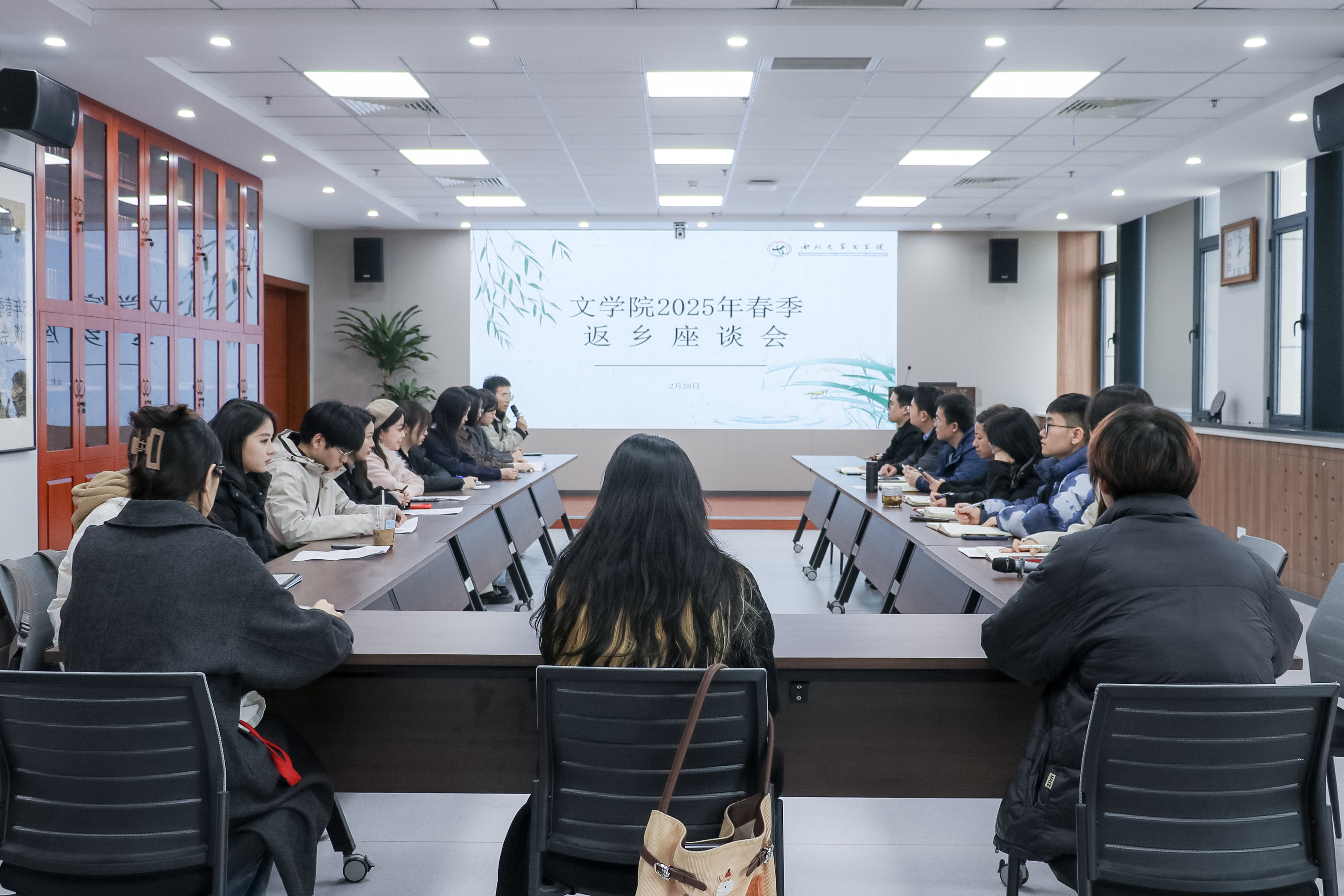 与会学生代表结合寒假期间的学习生活、实践见闻依次进行了分享,生动展现了文苑学子扎根祖国大地、献智家乡发展的青春风采。有同学在寒假期间走进基层社区,开展民俗、文化调研,利用专业所长助力家乡文化振兴;也有同学用脚步丈量乡土,走访杰出校友、榜样人物,在学习与交流中不断学习成长;有同学分享了自己参与家乡“暖冬行动”等志愿服务活动的经历,在奉献中领悟新时代青年的担当与责任;也有同学躬行践履,将社会实践与创新创业有机结合,对自身的发展规划有了更深刻的体会。同学们一言一语的真情流露,让我们看到返乡不仅是亲情的回归,更是一次向下扎根、向上生长的精神洗礼。家乡的变化带给他们惊喜与感动,大家也投入其中不断拓展自己的视野与见闻,将所学知识运用到实际生活。