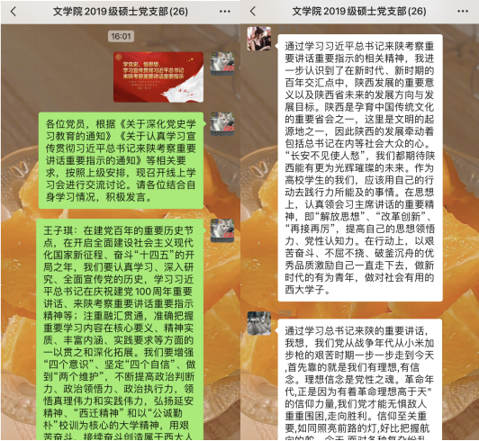 党的十八大以来,习近平总书记先后四次来到陕西调研考察,为我省在新时代新征程上做好各项工作指明了前进方向、提供了根本遵循。为深入学习贯彻习近平总书记来陕考察重要讲话重要指示精神,将其与习近平总书记“七一”重要讲话相结合,在全院上下形成学深悟实、融会贯通、真信笃行的浓厚氛围。根据省委教育工委《关于深化党史学习教育的通知》及校党委《关于认真学习宣传贯彻习近平总书记来陕考察重要讲话重要指示的通知》要求,近日,我院党委组织各研究生党支部开展主题学习活动,深入学习习近平总书记来陕考察重要讲话重要指示精神、习近平总书记“七一”重要讲话精神及党史学习教育推荐书目,进一步推动党史学习教育第二阶段走深走实。